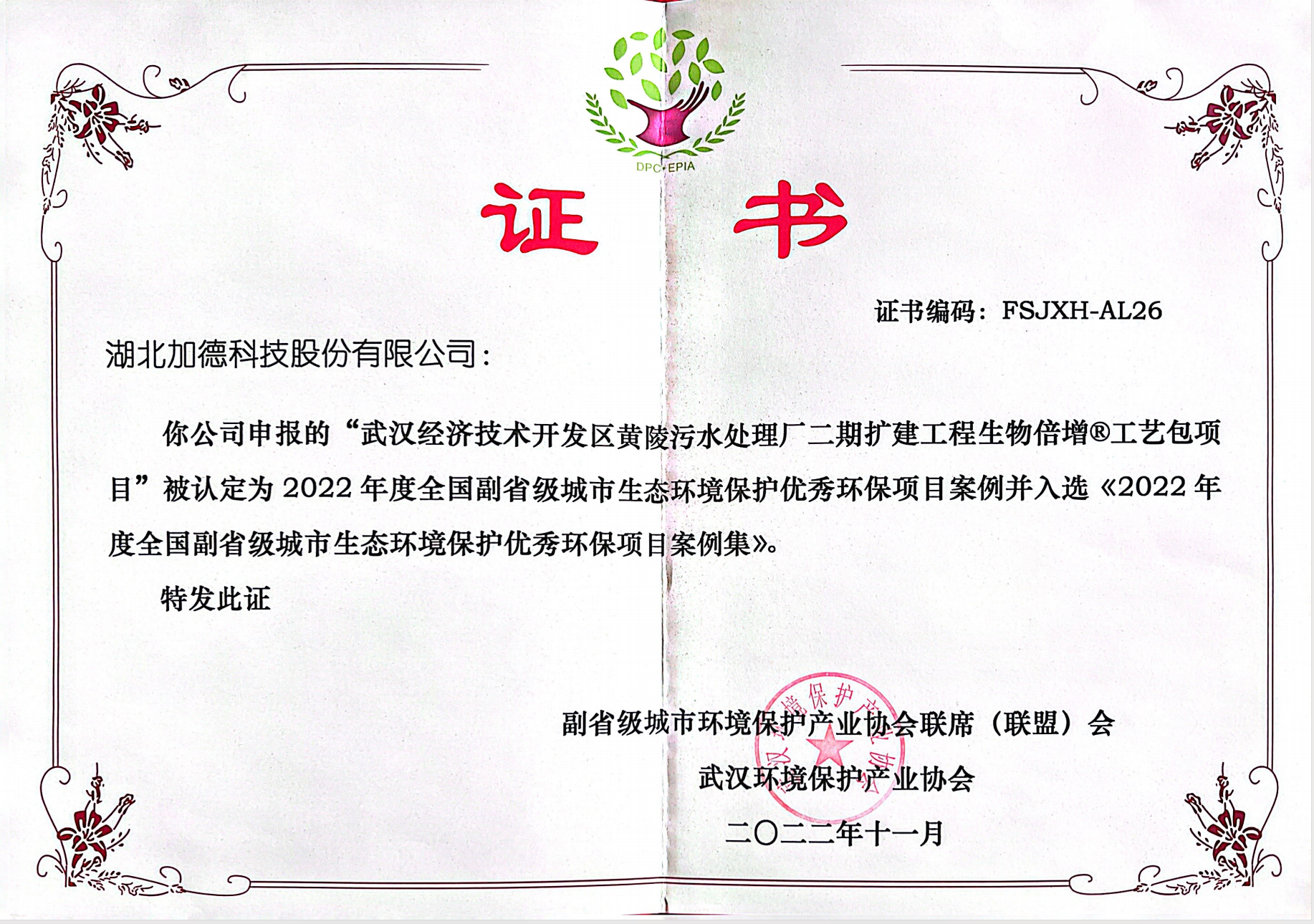 “武汉经济技术开发区黄陵污水处厂二期扩建工程生物倍增@工艺包项目”认证证书