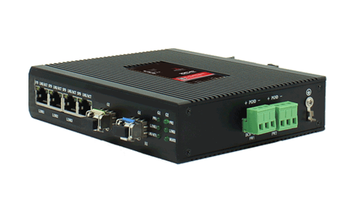 DIN卡轨式设计,标配4个10/100/1000M自适应电口 和1个千兆SFP光口(Auto MDI/MDI-X)。支持全双工和半双工自动协商方式; 所有端口均具备全线速转发能力,保障无阻塞报文转发。 符合IEEE802.3/802.3U/802.3x存储转发方式。