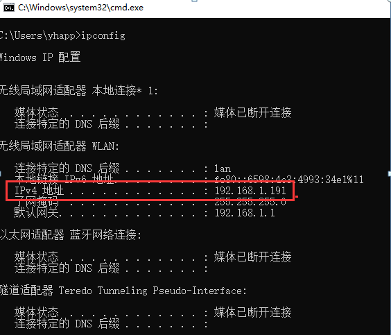 检查PC1、PC2的IP地址分配:分别在PC1、PC2“运行”中输入cmd,进入命令提示符,然后输入ipconfig并回车: